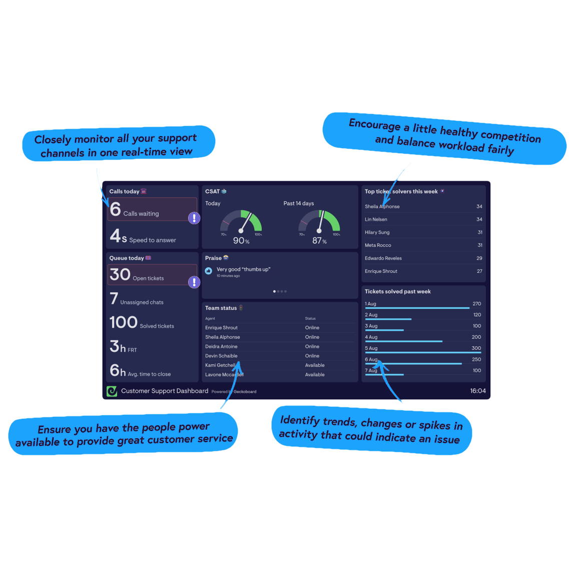 Customer support dashboards help Customer Service teams maintain a live view of important CS metrics like First Response Time and CSAT.