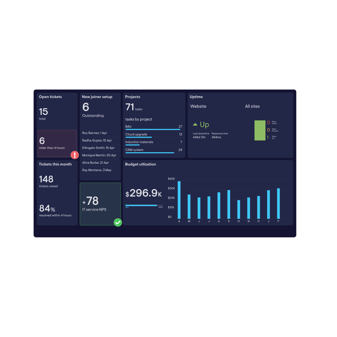 IT dashboards are used to monitor technical systems and processes, such as server capacity. It could also include dashboards that track day-to-day operations, such as how effectively an IT team is providing IT support to the rest of the organization.